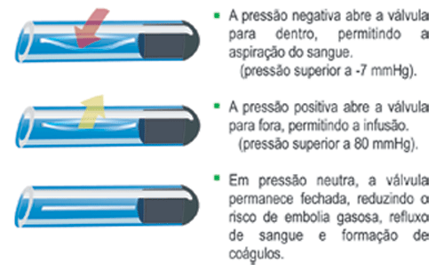 Os Cateteres Groshong incorporam a válvula patenteada Groshong de 3 posições, sensível à pressão. A válvula está localizada próxima à ponta fechada, arredondada e radiopaca do cateter, e permite infusão de fluidos e aspiração de sangue. Quando não está em uso, a válvula impede o refluxo de sangue e embolia gasosa permanecendo fechada. A válvula Groshong foi projetada para permanecer fechada entre -7 e 80 mmHg. Uma vez que a variação da pressão na veia cava superior é de 0 a 5 mmHg, a válvula mantém-se fechada à pressão venosa central normal. A pressão na veia cava superior deve exceder 80 mmHg para abrir a válvula para dentro. A pressão negativa (vácuo) também fará com que a válvula abra para dentro, permitindo a aspiração de sangue. A pressão positiva sobre o cateter (gravidade, bomba, seringa) abrirá a válvula para fora, permitindo a infusão de fluidos. A necessidade do efeito do anticoagulante de heparina é eliminada uma vez que a válvula fechada evita que o sangue penetre e obstrua o cateter. Se o cateter for aspirado, empurrando a válvula para dentro, ele deve ser injetado com salina normal para limpar o sangue do lúmen e permitir que a válvula retorne à sua posição fechada normal.