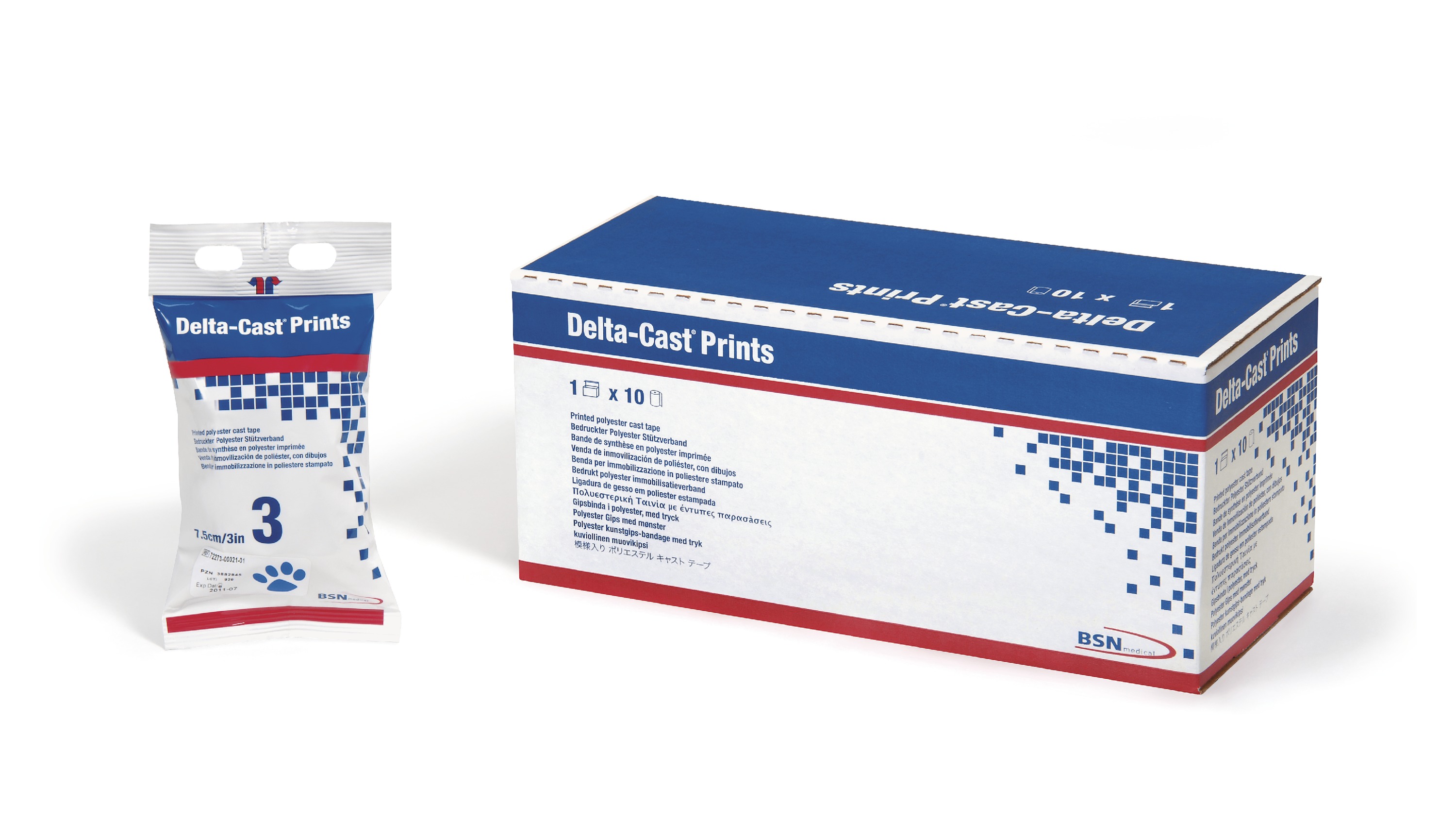 Delta-Cast Prints é uma atadura imobilizadora sintética composta por um substrato estampado patenteado, feito de fios extensíveis que se adaptam facilmente aos contornos corporais, proporcionando maior capacidade de moldagem.